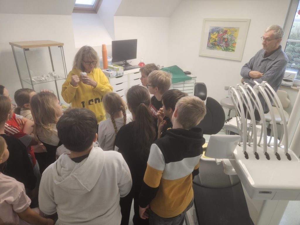 Vor Ort wurden den Schülerinnen und Schülern die verschiedenen Arbeitsbereiche einer Zahnarztpraxis anschaulich erklärt. Sie konnten moderne Geräte kennenlernen, Fragen stellen und sogar einen Blick hinter die Kulissen werfen. Besonders beeindruckend war es zu sehen, wie sorgfältig und präzise in der Zahnmedizin gearbeitet wird und wie wichtig die richtige Zahnpflege ist.